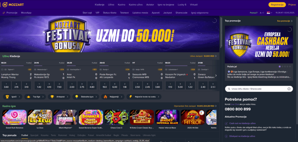 - Jasna struktura: sport, uživo klađenje, kazino i promocije lako su dostupni iz glavnog menija