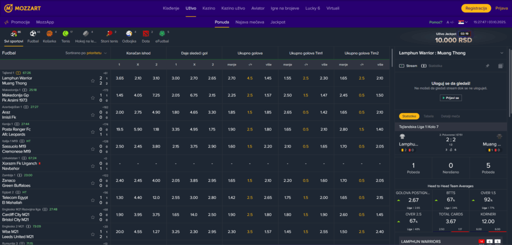 Mozzart ima snažno razvijenu sekciju za klađenje uživo, što je jedan od glavnih razloga zbog kojih ga igrači rado koriste. Ponuda je raznovrsna, interfejs pregledan, a kvote se osvežavaju brzo kako bi pratili tok meča.