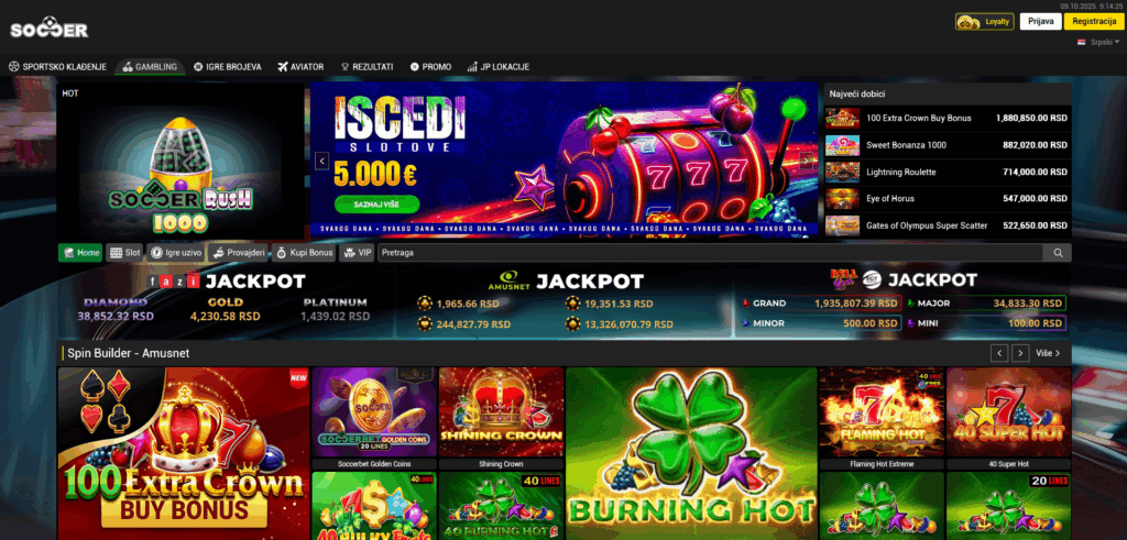 Pored sportskog klađenja, SoccerBet kazino postaje sve popularniji deo njihove ponude. Platforma je jednostavna za korišćenje, pregledna i redovno se dopunjava novim igrama renomiranih provajdera.